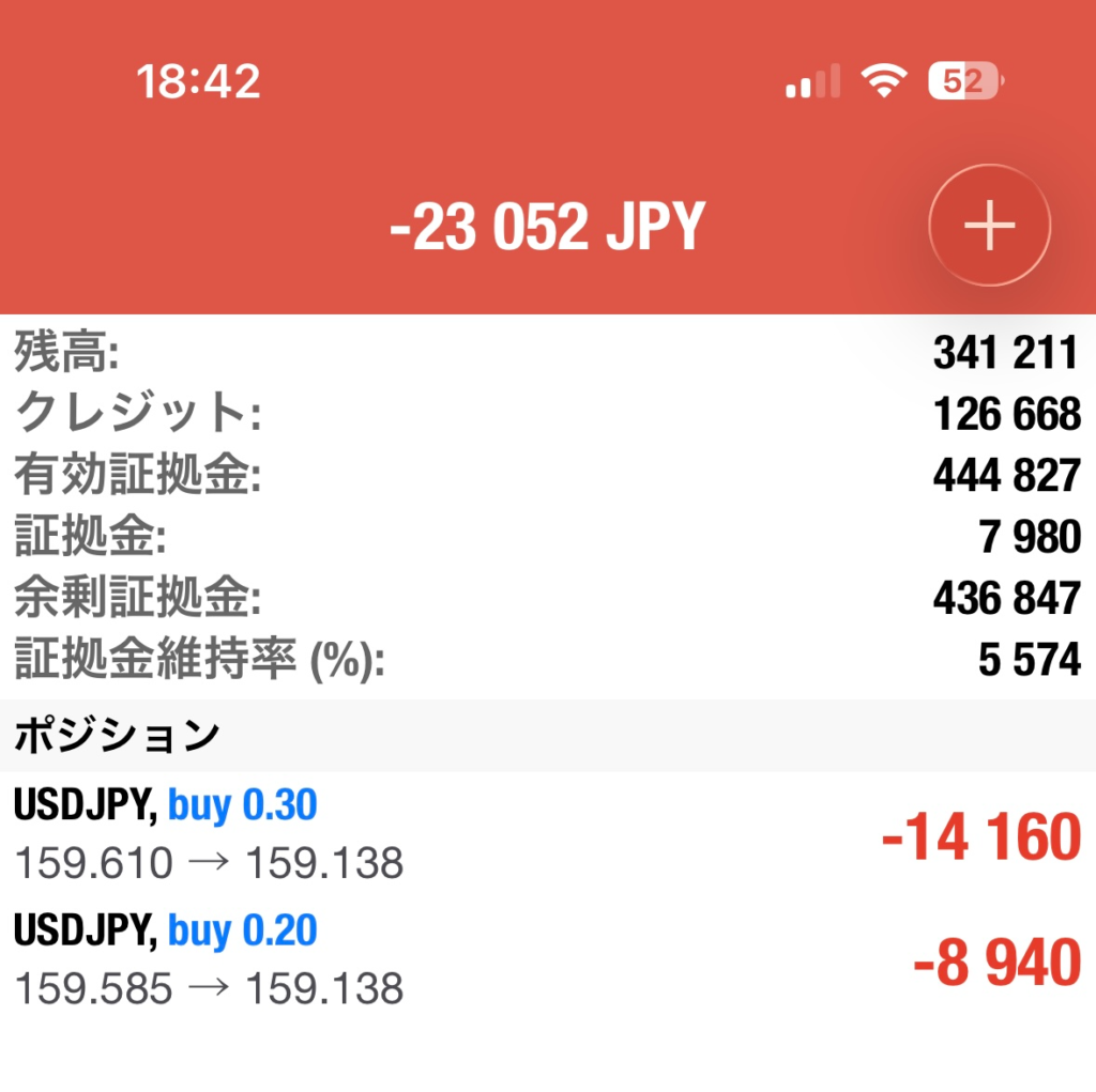 昨日の約19000円の含み損を抱えて迎えた今日の相場としては、一時的に159.4円くらいまで上がったものの、19時前の時点では159.1円くらい….160円を目指して上がってほしいところではあるが、介入の警戒感からか、なかなか上がらない。。。とはいえ夜中に158円台まで行ったものの159円台前半でうねうねしている感じ…