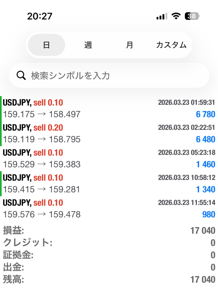 冒頭で記載した通り、上がった分下がるだろうという予想。ただ、朝からは上がり続けていたためショートをチマチマ追加していた。少しづつ利確して数百円ずつ回収していこうとしていたところ、思いっきり落ちてくれた為過去一の爆益!